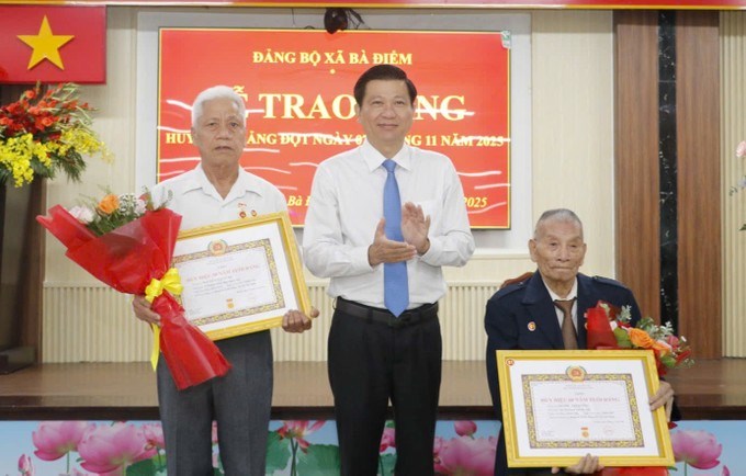 Lãnh đạo xã Bà Điểm trao Huy hiệu Đảng đến đảng viên. (Ảnh: SGGP)